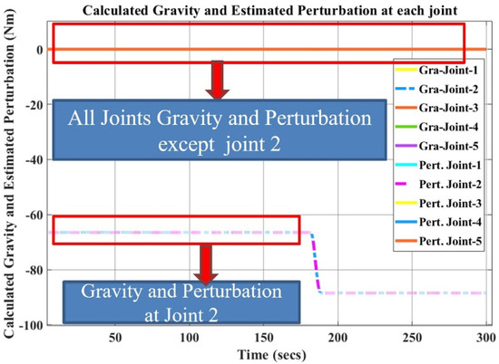 In the real world, calculating an accurate dynamic model of the system is problematic. Nonlinearities, unmodelled dynamics, and external disturbances play their roles (gravity, Coriolis, and inertia) in calculating dynamics. The gravity term equations are calculated graphically for our system and are estimated with Simscape gravity torque block (robotics toolbox) [24]. The calculated result has totally comparable conduct with toolbox one when a certain trajectory is provided at joint 2, as shown in Figure 4. The angle represents the i-th joint angle and represents a length the of i-th link of the robot manipulator. The gravity equation is calculated as follows: