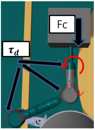 At the moment of collision in an unstructured environment, the most important factor to consider is the contact force/reaction force that the manipulator experiences at each joint. Since sensors cannot be used in current study, the estimation of contact force becomes critical. Early approaches to estimating contact force were introduced in [12] and implemented in a robot arm [13]. P. Hacksel et al. proposed an external force observer based on manipulator dynamics and only the position feedback to estimate the external force [12]. However, the disadvantage of this approach is that it is necessary to know the precise position information, and accurate dynamics equation of the robotic manipulator [14,15] shows the estimation of each joint’s external torque using motor current, but the drawback is that friction is very hard to estimate using this method.