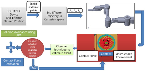 Figure 9 shows the complete methodology used in this study. First, the desired end-effector position is determined from the 3D haptic device, then the desired trajectory of the robot end-effector is generated. The robot follows the trajectory using the inverse kinematics of the system. It operates with the unstructured environment in which we do not have any information about the obstacle. When the robot collides with an obstacle the contact force has an impact on each joint of the robot manipulator in the form of external torque, which is estimated by the SPO. The end-effector reaction force is also estimated using estimated external torque. After obstacle detection, an APF is applied to avoid the obstacle.