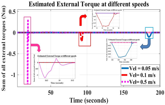All the simulations are performed in MATLAB, Simulink, and Simscape Multibody toolbox. To implement the collision detection algorithm, Equation (12) is used to estimate the external disturbance torque at each joint of the robot manipulator. When collision does not occur, the sum of the estimated external torque at all joints is zero. The sum of these torques at all joints considering different speeds can be seen in the no-collision case in Figure 10.