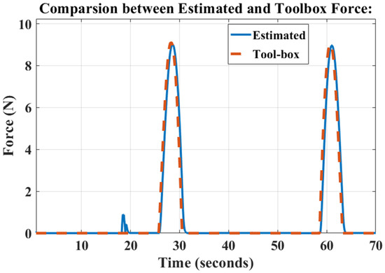 Next, the collision detection is considered as the end effector reaction force. At the time of collision with the obstacle, the robot scans the obstacle and records its position. Equation (15) is used at that moment to estimate the contact force for verification purposes. The estimated force is also compared with the contact force library in the Simulink. Both results were compared and found to be the same, which validates the contact estimation algorithm. The Figure 12 shows the results of the estimated and toolbox force.