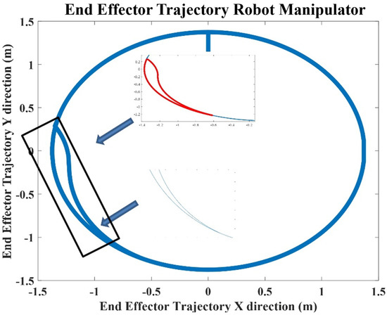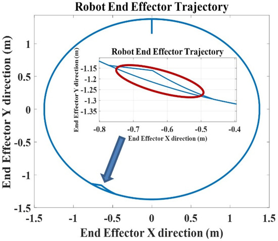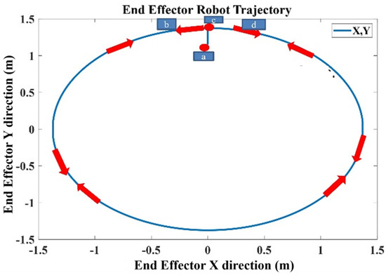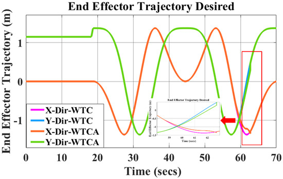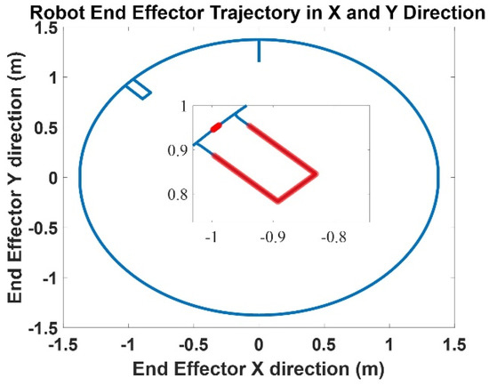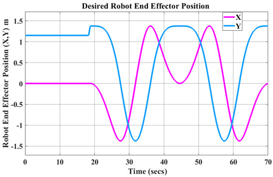 After detecting the obstacle using the SPO and estimating the end-effector contact force, the next and final step is to avoid the obstacle. At the time of collision, the proposed technique saves the robot end-effector position. The method used for collision in the current study is APF. It generates a repulsive potential when it comes near (threshold value) to the obstacle. The two different scenarios are presented, but for good understanding, let us define the desired end-effector trajectory first. The following Figure 13 and Figure 14 show the desired end-effector trajectory for the five DOF robot manipulator in x and y directions. In the RVI, the robot only moves in the x and y direction. Currently, we only consider the collision possibilities in the RVI. The collision can be either with the wall of the RVI or any material that manipulator is cutting.