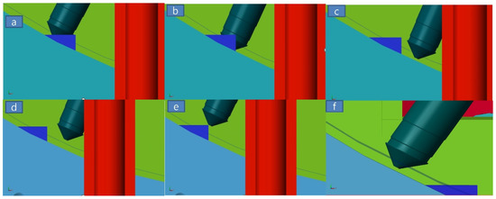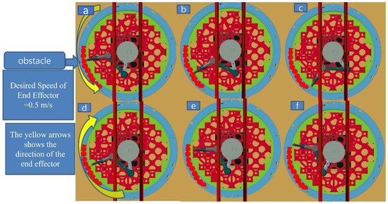 Continuous obstacle avoidance in simulator (end-effector); (a–c) collision detection (scanning); (d–f) collision avoidance after scanning and saving obstacle position (on return).