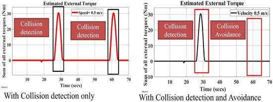 Third, the RVI wall is considered a continuous obstacle. The information regarding the obstacle is unknown. Therefore, according to proposed technique, the robot first detects and scans the obstacle position and records it, using the proposed estimated external disturbance torque. When the robot passes the same position, a repulsive force acts to change the trajectory and avoid collision. In Figure 19, the first figure shows the result when only the collision detection algorithm is implemented so it detects and scans the obstacle at time 25.86 s to 31.3 s and again detects the obstacle when it comes to the same position at time 59.5 s to 64.9 s. The second figure shows the outcome when collision detection and avoidance algorithms are implemented at the same time. First the collision detection algorithm detects and scans the obstacle (25.86 s to 31.3 s) from the estimated external disturbance torque and then, using the artificial potential field, obstacle collision is avoided. This is why the estimated external torque is zero from time 59.5 s to 64.9 s, which is a good sign for our system.