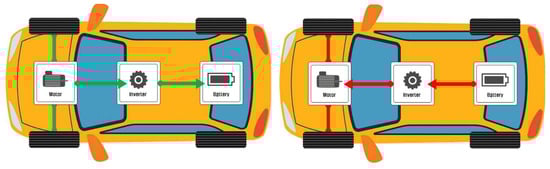 The difference between normal braking and regenerative braking is shown in Figure 2, where the left image represents regenerative braking and the right image shows a discharging process, as seen in [3]. The speed management process and braking conditions are key parameters in vehicle energy efficiency. In traditional vehicles, the driver manually controls the vehicle’s speed. It is indeed challenging to maximize the efficiency of a regenerative braking system because road conditions can vary significantly and cannot be easily predicted. Traditional methods for maximizing efficiency typically rely on accurate traffic information to determine the most efficient way to use regenerative braking. However, this can be difficult to obtain in real-time, especially if the vehicle is traveling on unfamiliar roads or in areas with limited traffic data. One way to overcome this challenge is to use sensors and various technologies to continuously monitor the road conditions and adjust the braking strategy. This can help to optimize the efficiency of the regenerative braking system and improve the overall performance of the vehicle.
