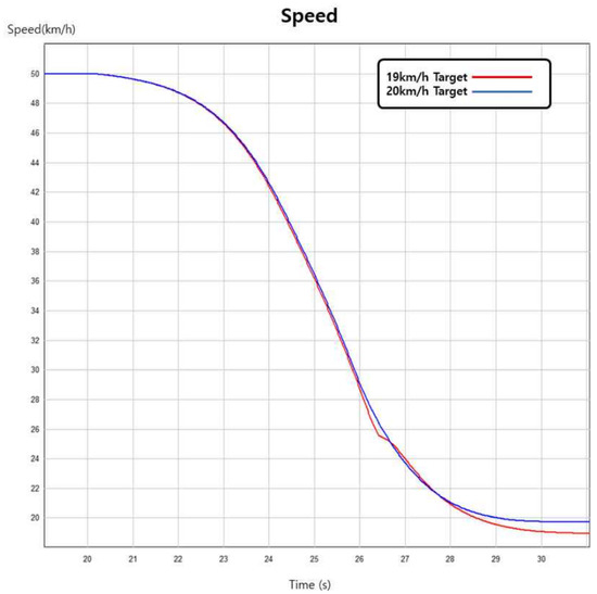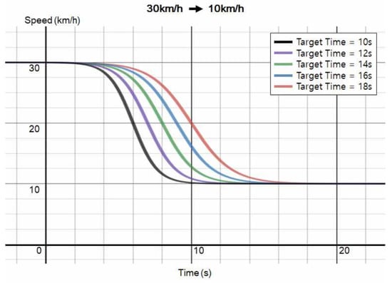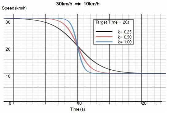k is obtained from Equation (5), and the time to reach the target speed is identified from the vehicle’s speed [19,20]. The speed is controlled by varying the tanh function, as shown in the speed graph in Figure 7.