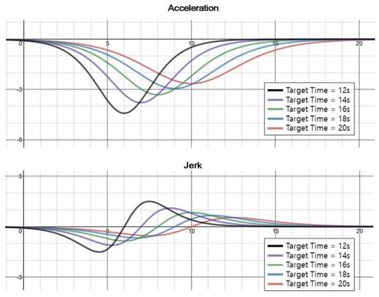 To ensure ride comfort, the motor torque must be evaluated along with acceleration and jerk [15]. According to the magnitude of k, the slope of the velocity change curve as shown in Figure 6 was obtained. The maximum deceleration was also determined.