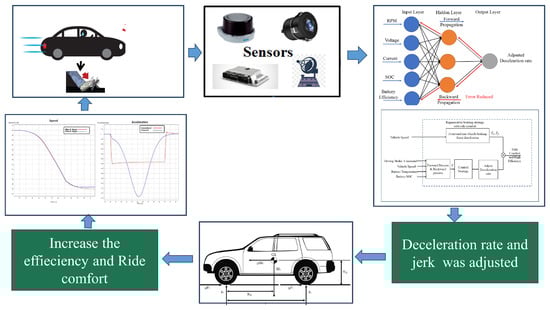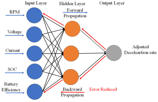The environmental data, collected by using the TTC and sensors, are fed into the neural network. After training the model with comfortable riding conditions, vehicle control is possible. The basic input values such as vehicle speed (revolutions per minute), voltage, current drawn from battery, battery SOC, and battery efficiency are input into the input layer [24,25]. The activation function at each hidden layer reduces the error in the output layer. The final output is the basic principle in the forward and backward propagation model. Figure 10 shows the algorithm for the proposed CRBS method.