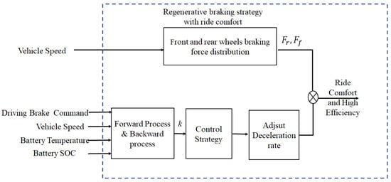 Figure 11 represents regenerative braking strategy. Front and rear wheel forces were distributed equally on the vehicle. By receiving the driving brake force command, backward propagation predicts the required force condition and adjusts the deceleration rate to achieve comfortable ride conditions. This proposed CRBS method was set to operate for 10 seconds, and during this set time, the deceleration rate was adjusted. The speed change in the vehicle depends on various factors, including the weight, speed, road surface condition, and road angle [26]. The regenerative braking force cannot exceed the maximum output of the motor when applying the control strategy. According to Equation (8), the speed must be controlled to ensure the regenerative braking force is within the limit. In addition, the deceleration and time required to reach the target must be obtained; deceleration can be obtained by controlling the throttle and regenerative braking. A flowchart of the proposed CRBS method is shown in Figure 12. The results predicted by using this algorithm were validated through simulations that use CarSim and MATLAB/Simulink and which are explained in the Results section [27].