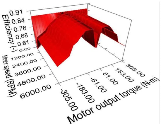 In a hybrid vehicle, the motor converts battery energy into kinetic energy to drive the vehicle. The motor torque is expressed in terms of the efficiency and angular velocity [28,29], as follows,