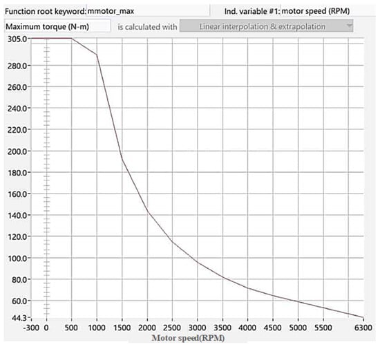 Finally, based on the relationship between the motor’s electrical output and efficiency, the electrical energy is converted into kinetic energy for regenerative braking. However, some energy loss can occur when converting kinetic energy into electrical energy. The torque performance curve of the motor, simulated by MATLAB/Simulink, is represented in Figure 14.