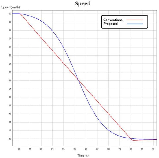 Speed comparison of conventional braking and proposed method when changing speed from 30 to 15 km/h. Both control methods reached 15 km/h within 10 s.