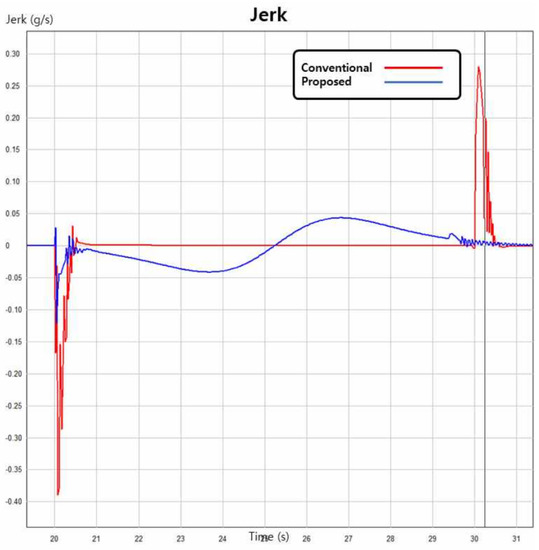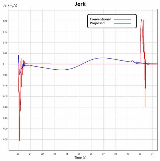 For Cases 1 and 2, Figure 19 and Figure 22 indicate that the vehicle speed decreased by balancing the deceleration and riding comfort when applying the CRBS method. Conversely, when the conventional brake control is applied, the vehicle stops suddenly without considering the riding comfort. Furthermore, by observing the corresponding acceleration shown in Figure 20 and Figure 23, the proposed method reduces the vehicle speed more gently than the conventional method, which suddenly reduces the vehicle’s acceleration. This can be more clearly observed in the low jerk of the proposed method compared to that of the conventional braking system (Figure 21 and Figure 24). It should be emphasized that the maximum acceleration (−0.089 and −0.126 g for Cases 1 and 2) and jerk (−0.05 g/s ∼ 0.03 g/s and −0.12 g/s ∼ 0.05 g/s for Cases 1 and 2) of the CRBS method remain within the Powell and Hubbard domains. In contrast, the jerk results (−0.35 g/s ∼ 0.21 g/s and −0.38 g/s ∼ 0.28 g/s for Cases 1 and 2) of the conventional braking system fail to meet the domains due to the sudden braking.