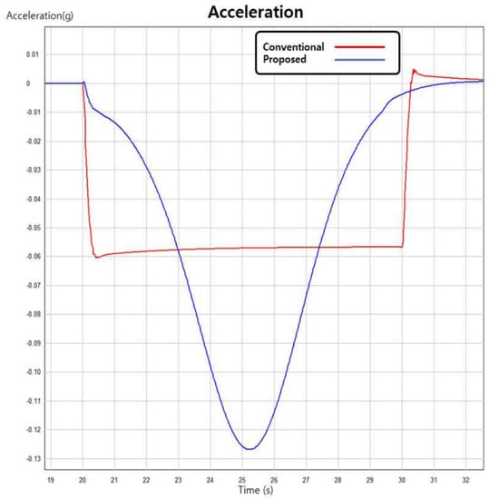 In the process of changing the vehicle speed, acceleration and jerk have a large influence on the riding comfort of passengers. Jerk represents the rate of change of the acceleration and known to have an impact on driving comfort that is consistent with subjective human perception. It has been reported that passengers feel more comfortable when the amplitudes of jerk and deceleration are smaller [11], and Hubbard [30] found that jerk should not exceed 2.94 m/s3 (0.3 g/s) to ensure passenger comfort. In addition, Powell’s deceleration domain, in which passengers feel comfortable, was reported as 1.3 m/s2 ∼ 2.5 m/s2 (0.134 g ∼ 0.257 g). Considering the maximum regions of passenger comfort, the results of the CRBS approach show that the proposed method is effective in improving riding comfort.