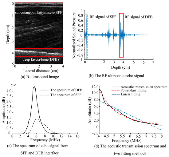 Figure 1 shows the calculation procedure for the ATS of the skeletal muscles used in this study. Due to the big difference in acoustic impedance [26], the interfaces of SFF and DFB are evident and distinguishable in the B-ultrasound images, as shown in Figure 1a. According to their depths, the corresponding echoes of SFF and DFB can be abstracted from the RF ultrasonic signals, as shown in Figure 1b. Echoes of SFF path through the skin and fatty layers, and echoes of DFB path through the skin, fatty, and skeletal muscle (biceps brachii, brachialis) layers. In contrast to the echoes of SFF, the echoes of DFB additionally carry the acoustic transmission properties of the skeletal muscles. The echo signal of each channel is multiplied by a Hamming window of length L (L = length of echoes) to suppress spectral lobes, and the spectrum is obtained by fast Fourier-transform (FFT).