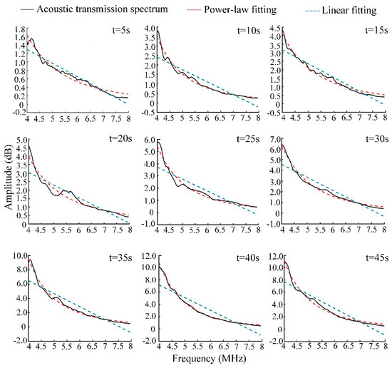 The linear fit is frequently employed to analyze the ultrasonic spectrum [28], while the acoustic attenuation in the muscle tissue obeys the power-law function in the frequency domain [29]. Therefore, we fitted the ATS with both linear function (A(f) = af + b) and power-law function (A(f) = αƒβ), as shown in Figure 1d. Figure 2 shows the ATSs of volunteer 1 every 5 s during the SC process. For each subject, the regression coefficients were between 0.79 and 0.95 for the linear fit and between 0.94 and 0.99 for the power law fit. The results suggest that a power-law model is more appropriate for the ATS analysis. While the linear and power-law models represent specific physical laws, their coefficients have distinct physical meanings.