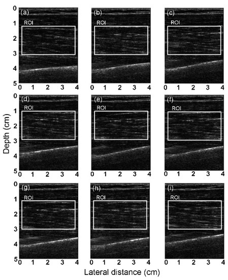 A multi-channel ultrasound system (Vantage 256, Verasonics Inc., Kirkland, WA, USA) and a linear array transducer (128 elements, L11-5v, Verasonics) with a central frequency of 7.8 MHz were used to acquire the ultrasonic B-mode images and RF signals. The image depth was 5 cm, and the width was 4 cm. The sampling frequency was 31.25 MHz. The system settings, such as the time gain compensation and focal depth, were kept constant in the experiment.