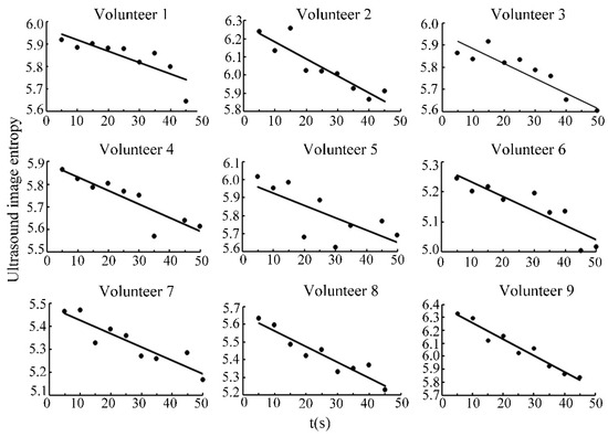 Previous studies revealed that the image entropy of the B-ultrasound image decreases with muscle fatigue [14]. Thus, we calculated the ultrasound image entropy (USIE) of each volunteer during the SC test and proved that the muscles in this study underwent a fatigue process. Taking volunteer 1 as a case, the center part of the muscle layer is chosen as the region of interest (ROI) in Figure 3, and the corresponding USIEs are calculated. Linear fits were used to analyze the variability of the USIEs. The USIEs of each volunteer in Figure 4 showed a similar decrease during the SC test.