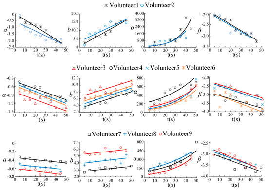 Depending on the two fitting models, we calculated the coefficients a, b, α, and β of ATS along with the SC process, and drew the coefficients of volunteers with similar MVC forces in one figure, as shown in Figure 5. The slope a decreases linearly, and the intercept b increases linearly; the α increases exponentially, and the β decreases linearly along with the duration of SC of each volunteer. For the volunteers with similar MVC forces, their a, b, and α vary similarly along fatigue.
