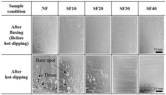 Figure 1 presents images of the surfaces of the steel samples before (i.e., after fluxing and drying) and after hot dipping. Salt precipitation was visible on the NF samples, whereas the modified flux (i.e., SF10–SF40) did not precipitate. After hot dipping, surface defects such as bare spots and dross were observed on the coating layer of the NF sample. The SF10–SF40 samples exhibited decreasing defects. The SF30 sample had the best coating surface.