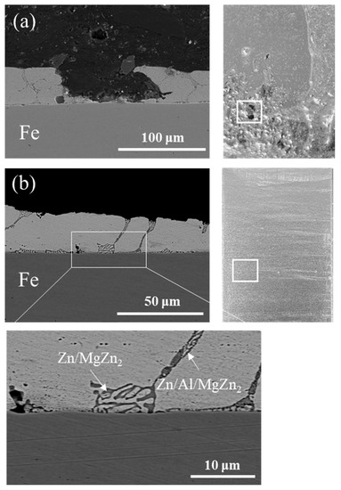 From the surface evaluation, the SF30 sample exhibited the best results. Therefore, the properties of the NF and SF30 samples were investigated and compared in the subsequent experiments. SEM was used to analyze the cross-sectional microstructures of the samples. Secondary electron images of the hot-dipped samples are shown in Figure 2. The NF sample (Figure 2a) shows the presence of a bare spot (i.e., region without coating on the substrate). The coating defects can be attributed to the failure to form a stable inhibition layer of Fe2Al5, which marks the poor reactivity between the steel and molten metal. This poor reactivity is further confirmed by the EPMA results. The SnCl2 flux (Figure 2b) facilitates the formation of a stable interface layer, thereby achieving a uniform Zn–1Mg–1Al alloy coating layer.