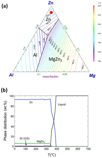 (a) Phase diagram (Zn: 85%–100%, Mg and Al: 0%–15%) and (b) solidification behaviors of the Zn–1 wt.% Mg–1 wt.% Al composition (Liquid → Solid).