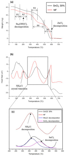 The thermal decomposition behavior of the NF and SF30 fluxes was studied using TG-DTA, as shown in Figure 6. As both fluxes are hygroscopic, moisture evaporation lowered their weight in the temperature range 100–150 °C (R1), as confirmed by the endothermic peak of the DTA curve. A fast weight loss occurred in the NF flow at 310–400 °C, which is the ammonium chloride decomposition temperature range (R3). Weight reduction slowed after ammonium chloride decomposition in the coating bath at 400–500 °C and was further slowed above 500 °C. Finally, the flux decomposition was completed at 600 °C. Meanwhile, for the SF30 flux, an additional decomposition behavior of tin chloride was observed at 340–460 °C, which is the decomposition temperature for ammonium chloride (R4). The endothermic peak of the DTA curve overlapped, and the deconvolution of the peak was achieved, as shown in Figure 6c. Unlike NF, the weight reduction was continuous in the coating bath temperature range 400–500 °C due to the decomposition of SnCl2, which continued until the end of the flux decomposition. Therefore, SF30 decomposed at a lower temperature than NF. From the experimental results, the SnCl2 addition to the flux promoted the decomposition of the flux in contact with the molten metal, thereby improving the wettability of the molten metal and suppressing the residual Al/Cl compound formation in the coating layer.