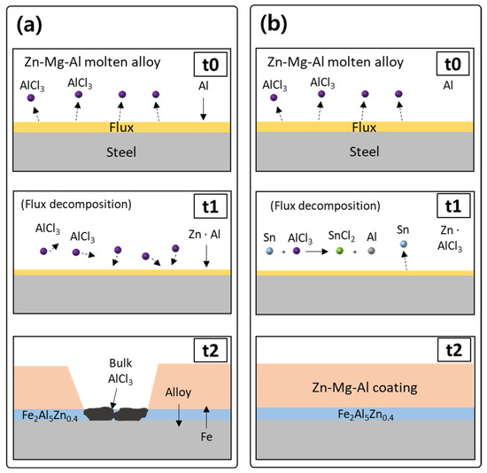 The formation of AlCl3 depletes the flux (t1, Figure 7a), incorporates it into the coating layer, and fosters the coating defects (t2, Figure 7a) (i.e., deterioration of the coating characteristics), as shown in the EPMA results (Figure 3a). Meanwhile, in the SF samples, SnCl2 was reduced to Sn by reacting with Zn, according to the following reactions: