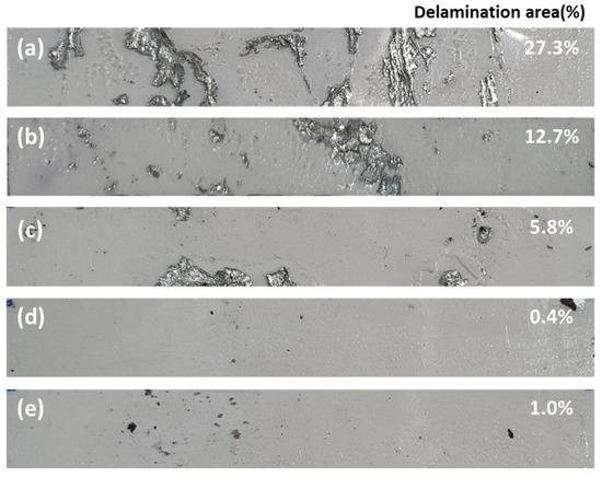 T-bending test images of the Zn–1Mg–1Al hot-dip-coated steel with respect to the flux composition: (a) normal flux, (b) 10% SnCl2, (c) 20% SnCl2, (d) 30% SnCl2, and (e) 40% SnCl2.