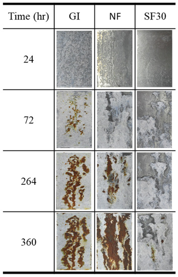 Figure 9 shows the surface changes in the samples according to the salt-spray time. Based on 5% of the surface area of the red rust, GI developed red rust after 70 h. For the NF sample, the occurrence time of red rust (170 h) was slower than that of the GI specimen. However, the red rust area increased rapidly owing to the surface defects, such as bare spots. The red rust occurrence time of SF30 was >500 h, demonstrating its excellent corrosion resistance, which was approximately eight times higher than that of GI. A high-quality Zn–1Mg–1Al alloy layer was formed using the SnCl2-added flux, and Mg2+ and Al2+ cations dissolved from the intermetallic compounds, such as Zn/MgZn2 and Zn/Al/MgZn2, in the coating layer precipitated in the cathode region on the surface of the coating layer to form dense and stable corrosion products (e.g., Simonkolleite).