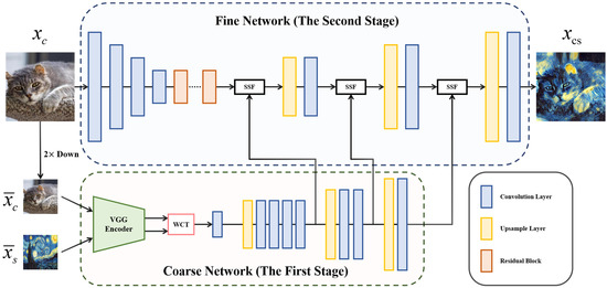 - We first proposed a coarse network to generate reconstructed coarse stylized features at low resolution, which can capture the main structure of the content image and transfer the holistic color distribution of the style image. Then, we proposed a fine network to enhance local style patterns and three SSF modules to selectively fuse the reconstructed stylized features to reconstructed content features at different levels.