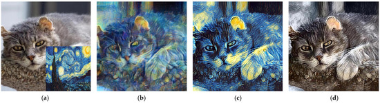 Different stylization results from the same content image and style image: (a) the content image is a cat, and the style image is Starry Night by Vincent van Gogh; (b) this stylized image is generated directly by our coarse network in the first stage; (c) the final stylized image is generated by our full model in the second stage; (d) this stylized image maintains the same color as the content image using color control.