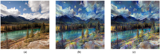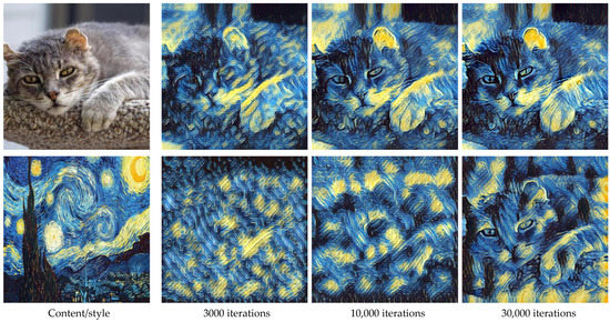 - Gatys, L.A.; Ecker, A.S.; Bethge, M. Image Style Transfer Using Convolutional Neural Networks. In Proceedings of the 2016 IEEE Conference on Computer Vision and Pattern Recognition (CVPR), Seattle, WA, USA, 27–30 June 2016; pp. 2414–2423. [Google Scholar] [CrossRef]