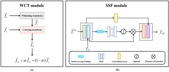 The architecture of the SSF module is shown in Figure 4b. First, we concatenate the reconstructed coarse stylized features and the reconstructed content features as input . The reconstructed content features are the output of the convolution layer in the decoder of the fine network (except that the first SSF module uses the content features from the encoder of the fine network as ). We adopt an average-pooling operation to aggregate the spatial information of to generate the input of the multilayer perceptron, which is adopted to produce an attention map as the weight matrix. In summary, the attention map is calculated as follows: