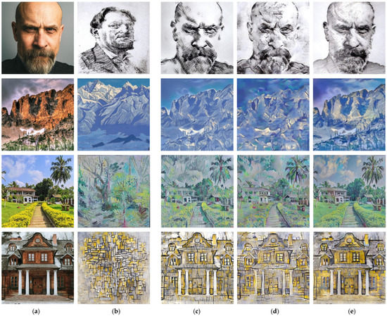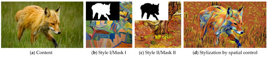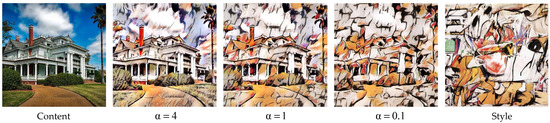 - Gatys, L.A.; Ecker, A.S.; Bethge, M.; Hertzmann, A.; Shechtman, E. Controlling Perceptual Factors in Neural Style Transfer. In Proceedings of the 30th IEEE/CVF Conference on Computer Vision and Pattern Recognition (CVPR), Honolulu, HI, USA, 21–26 July 2017; pp. 3730–3738. [Google Scholar] [CrossRef]
