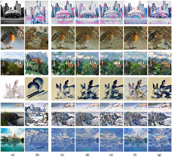 As shown in Figure 7, we compare our method with other state-of-the-art style transfer methods. Gatys et al. [1] proposed the original optimization-based style transfer algorithm, which can transfer the overall style texture and the color distribution. However, some incongruous textures appear in the stylized images, leading to the stylizations’ looking unnatural (e.g., rows 4, 5, and 6). Similar to our method, the method proposed by Johnson et al. [3] is also a feed-forward method. It can combine the local color and texture of style images with the structure of the content but often maintains too many content structures and may play a role in shifting the color histogram only in some cases (e.g., rows 1, 2, and 3). AdaIN [5] and SANet [22] are both arbitrary style transfer models, which mainly transfer simple style patterns. AdaIN often fails to transfer the color distribution of style images, and SANet has the severe problem of messy texture and disordered structure (e.g., rows 4, 5, and 6). All of the methods mentioned above maintain some unnecessary small local structures of the content images, and the essential local structures of style images are not integrated into the target image. In contrast to these methods, our model can simultaneously transfer the style color distribution accurately and combine the local style structure with the global content structure. For example, in the fourth row, the image of the rabbits generated by our method looks more harmonious and natural in the stylized image. It seems as though the style image consists of ink dots; the same artistic expression can be exhibited by our method.