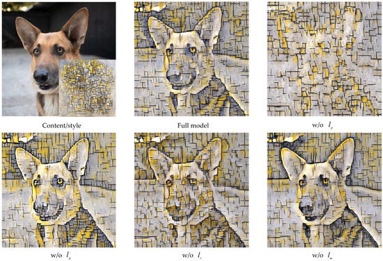 We conduct ablation experiments to verify the effectiveness of each loss term used for training our model, and the results are shown in Figure 9. (1) Without perceptual loss , too many structures of the content image are discarded; for example, the basic structure of the dog disappears in the stylized image. (2) Without Gram matrix loss , the stylization result is acceptable because mean-variance loss has a similar effect to , but the color distribution of the stylized image is slightly different from that of the style image. Moreover, the textures of the dog in the stylized image are increasingly denser and smaller. (3) Without rEMD loss , the texture distribution is chaotic, and some visual artifacts occur in the stylized image. (4) Without mean-variance loss , the global color distribution of the stylized image is not exactly the same as that of the style image; for example, the dark color of the dog in the stylized image is more similar to that in the content image. This dark black color is completely absent in the style image.