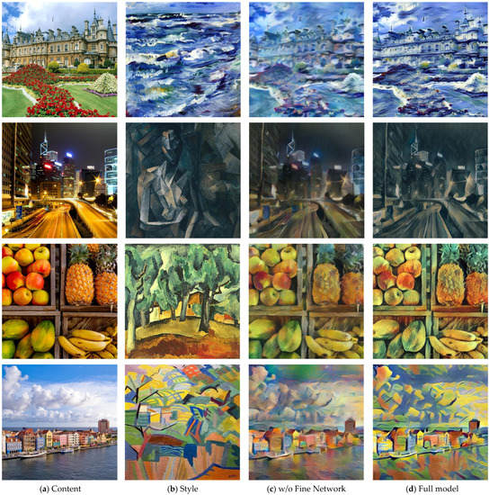 Comparison of stylized images of the full model and the model without the fine network: (a) the content images; (b) the style images; (c) the stylized images generated by the model without fine network; (d) the stylized images generated by full model.
