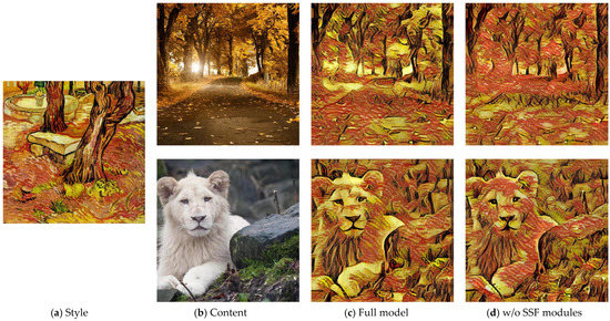 We compare two feature fusion methods through some experiments. In the first method, the reconstructed coarse stylized features from the coarse network are fused to the reconstructed content features in the fine network on the basis of our SSF modules. In the second method, we directly concatenate these two features for feature fusion. As Figure 13 shows, the stylization results that are based on the second method are transferred to the wrong color distribution in some regions. According to the first method, our model can accurately transfer the color distribution, and more-natural textures in the stylized images can be generated by selecting more-critical information.