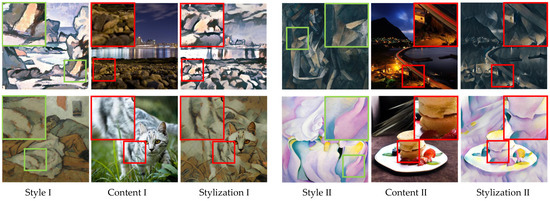 Artistic style transfer is an attractive image-processing technique that is used to generate a new image that preserves the structure of a content image but carries the pattern of a style image. Recently, the seminal image-optimization method proposed by Gatys et al. [1] was used to achieve style transfer by adopting the correlation of features extracted from a pretrained deep neural network and the iterative optimization process. Like the method presented by Gatys et al. [1], style transfer by relaxed optimal transport and self-similarity (STROTSS) [2] is also an image-optimization style transfer method; this method has achieved superior stylization results by adopting the relaxed earth mover’s distance (rEMD) loss in a multiscale optimization process. However, the expensive computational cost of these image-optimization methods restricts their use in practice applications in industry. To speed up the optimization procedure, Johnson et al. [3] and Ulyanov et al. [4] proposed model-optimization style transfer methods. They train a feed-forward neural network that can be used to synthesize images with a single given style image in real time. Both adaptive instance normalization (AdaIN) [5] and whitening and coloring transforms (WCTs) [6] are model-optimization methods but are also arbitrary style transfer methods, in which style patterns of arbitrary style images are transferred by adopting some feature transforms. After reviewing these methods, we have found that although local style texture and content structures can generally be combined, some key structures of the style image are not accurately learned. For example, the color blocks and brushstrokes that constitute the main objects in style images are not transferred very well. Meanwhile, in some cases, these methods produce distorted objects and incongruous artistic effects in stylized images. Therefore, our main task is to transfer the local structure of the style image to the content image and adopt a coarse-to-fine strategy to enhance the artistic details of the stylization results.