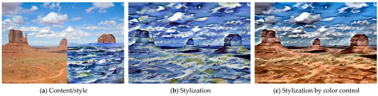 The goal of style transfer is to combine the texture of a style image with the structure of a content image. Gatys et al. [1] proposed a seminal iterative method that was based on a pretrained visual geometry group (VGG) network [7]. In this method, the content structure and the style texture can be used to synthesize a new image, but it is expensive, and a stylized image is generated only after the training process has been completed. Inspired by Gatys et al. [1], Johnson et al. [3] proposed a feed-forward method, which can be used to synthesize arbitrary images with a fixed style by an encoder-decoder architecture; the time and computation costs are reduced when using this method. Numerous methods have been developed to speed up the style transfer process [4,8] and improve the visual quality [9,10,11]. Sanakoyeu et al. [12] also improved the stylization quality by proposing a style-aware loss, but they trained a network with a set of style images instead of a style image. This approach aimed to combine many style images created by one artist to synthesize a stylized image with the overall style of this artist. The dual style generative adversarial network (DualStyleGAN) [13] is proposed to characterize the content and style of a portrait by retaining an intrinsic style path to control the style of the original domain and an extrinsic path to model the style of the target extended domain. Peking Opera face makeup (POFMakeup) [14] also is a portrait style transfer method that can transfer the style of a portrait with a Peking Opera face to a target portrait. Lin et al. [15] combined a universal style transfer method with image fusion and color enhancement methods to solve the problems of the color scheme, the strength of style strokes, and the adjustment of image contrast.