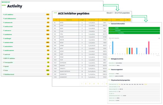 Access to the information map of the peptide is through the database heading, and for this purpose, two options are provided: Browse and Search. The Browse option provides general information about the available data and three search options by activity, source, and length with the corresponding graph representing the individual stocks. For each of them, the information is visualized in a similar way. Figure 2 shows the workflow of the Browse by Activity option. It is demonstrated by screenshots of the single peptide information card access pages. After selecting an activity, the results are visualized by pages and through details the user can go to the complete information of the selected peptide sequence.