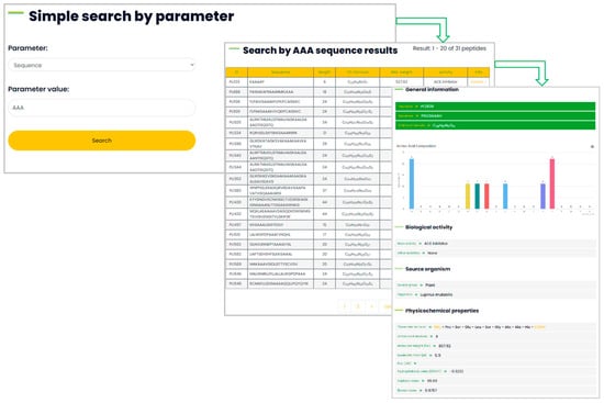 The second possibility to access information is through the Search option. The search can be carried out according to the following parameters—ID, sequence, length, activity and organism. After selecting a parameter from the drop-down menu and a value for this parameter, the results are visualized again and from there the user can go to the information map of the peptide of the peptide (Figure 3).