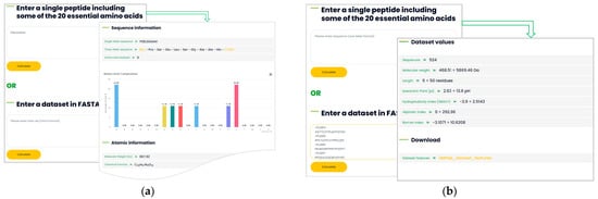The input screen of the DMPep physicochemical feature extraction tool allows visualization of the values of a single peptide and an option to download them in tabular format (Figure 4a), as well as to calculate the same features for an entire dataset proposed by the user. In this case, the features are the number of peptides in the dataset, minimum and maximum values of molecular weight, length, isoelectric point, grand average of hydropathy index (GRAVY), aliphatic index, protein-binding potential index, and a file with the calculated values for all peptides (Figure 4b).