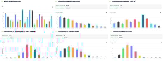 Summary statistics information of all database records is presented in the statistics menu. Six graphs provide information on the frequency distribution by amino acids, and the distributions for molecular weight, pI, GRAVY, Aliphatic index, and Boman index (Figure 5). This information can be displayed both for all peptides and for any available biological activity.