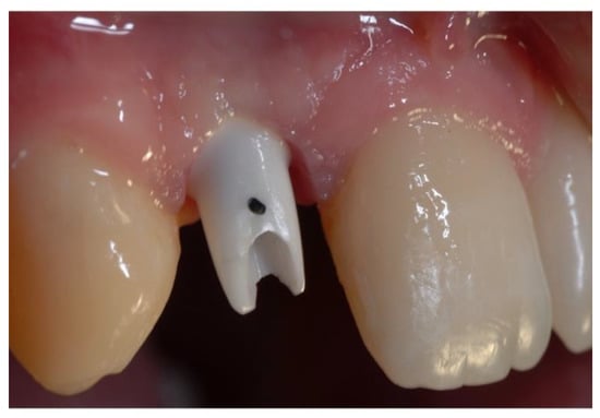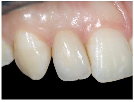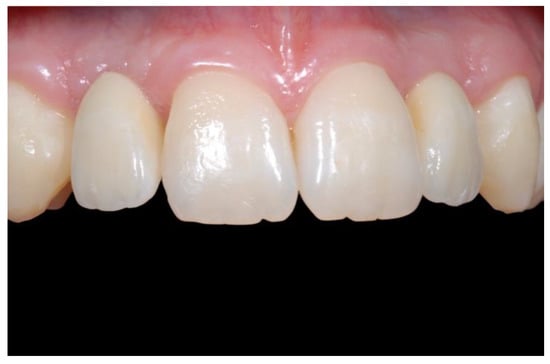 - Prosthetic approach: the missing maxillary lateral incisor is replaced by means of an inlay bridge (i.e., Maryland bridge) or a fixed partial denture (metal–ceramic or all-ceramic) sustained by the upper canine and central incisor [11,12]. The proper position of the canine is a paramount factor, since an adequate space in occlusion is indispensable to guarantee the correct thickness of an inlay bridge. Furthermore, a sufficient space between the upper central incisor and the upper canine is necessary to realize a prosthetic restoration of appropriate size.