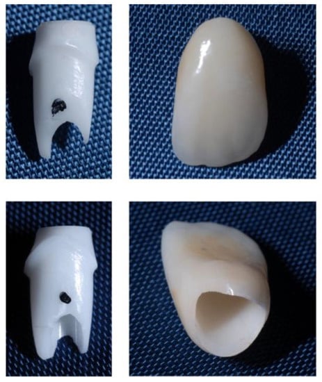 - Kinzer, G.A.; Kokich, V.O., Jr. Managing congenitally missing lateral incisors. Part II: Tooth-supported restorations. J. Esthet. Restor. Dent. 2005, 17, 76–84. [Google Scholar] [CrossRef] [PubMed]