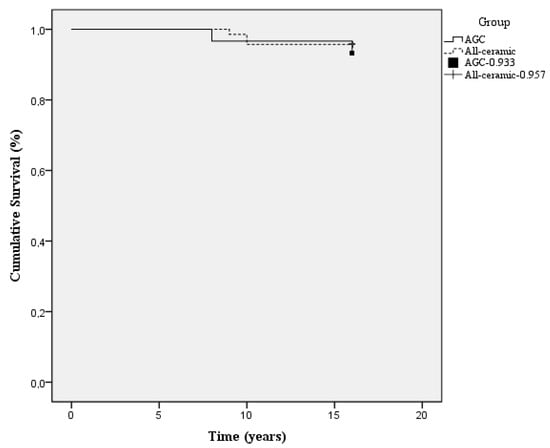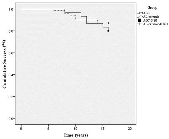 Kaplan–Meier graph showing cumulative success rates in relation to time. Two different curves were reported for patients wearing AGC and all-ceramic crowns, respectively.