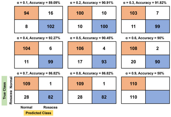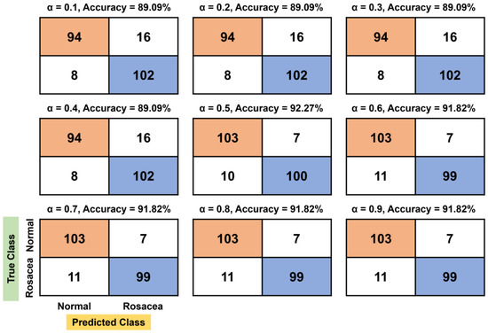 For the biquadratic function, a single α (0.5) shows the best accuracy (92.27%), while two stagnant regions (0.1–0.4 and 0.6–0.9) reveal accuracy values at 89.09% and 91.82%, respectively (Figure 6). At the confusion matrix of highest accuracy (92.27%, α = 0.5), 9.09% (10/110) of rosacea and 5.45% (6/110) of normal skin are misinterpreted as normal skin and rosacea, respectively.