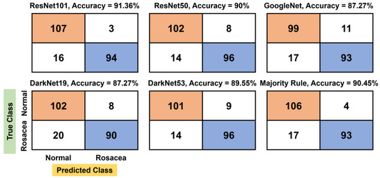 The confusion matrix created by the majority rule yields 90.45% accuracy as well as TN (106), which is the second largest, following ResNet-101 (91.36% for accuracy and 107 for TN) (Figure 7). In addition, in the majority rule, 15.45% (17/110) of rosacea and 3.64% (4/110) of normal skin are misinterpreted as normal skin and rosacea, respectively.